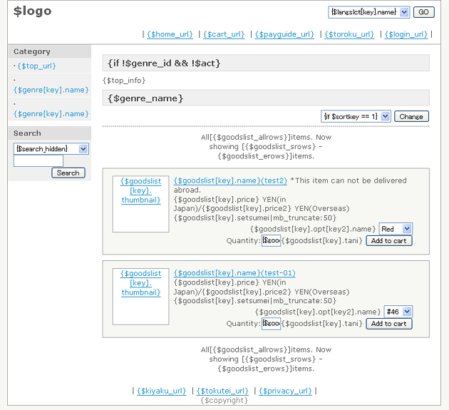 テンプレートHTMLとは、HTMLを使用し作成されたページに、変数(例 {$info} 組み込むことにより、「マルチリンガルカート/Multilingualcart」に登録されたデータ(商品など)を表示する仕組みのことです。HTMLの知識があれば、テンプレートHTMLを編集することによって、デザインを自由にカスタマイズすることが可能です。 トップ画面のテンプレートHTMLを例にご説明します。 ![]() 上記のテンプレートHTMLには、 {$info} などの { と} ( デリミタ)で括られた中に 先頭にドル記号 $ のついた文字列があります。この部分を「変数」と呼び、「マルチリンガルカート/Multilingualcart」に登録されたデータに置き換わって表示される訳です。 上記のテンプレートHTMLを使用して「マルチリンガルカート/Multilingualcart」で表示すると以下のようになります。 ![]() テンプレートの編集