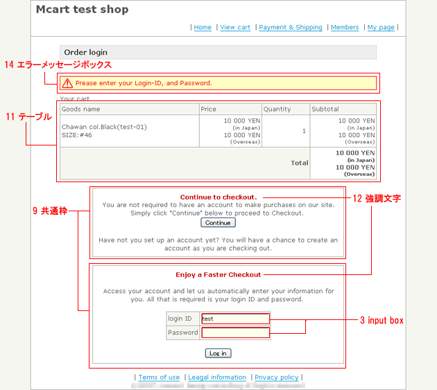 注文用会員ログイン画面内の太字・国外配送制限商品のワーニング表示色 |