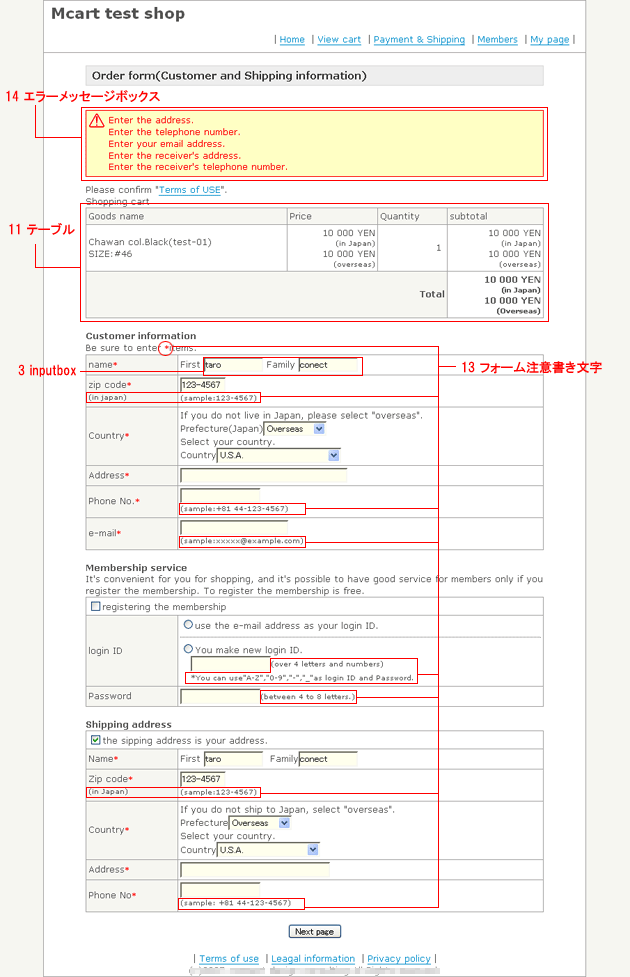 オーダーフォーム等入力エリアの背景色・文字サイズと文字色 |