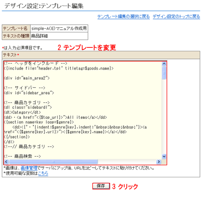 2.テンプレートを変更します。 ※テキストエディタ等にコピー&ペーストして修正すると楽に修正できます。 ※入力エリアにカーソルを置き[Ctrl]+[A]で「すべて選択」し、[Ctrl]+[C]で「コピー」して、[Ctrl]+[V]で「ペースト」すると作業が楽です。 3.変更が完了したら[保存]ボタンをクリックします。
