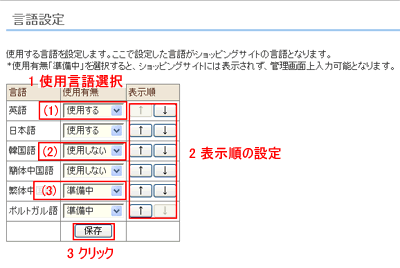 ※言語を[使用する]と設定してもその言語のデザインテンプレートを設定していなければその言語のショップは表示されません。例えば「日本語」と「英語」を表示する場合「日本語」「英語」の二つのテンプレートが必要です。